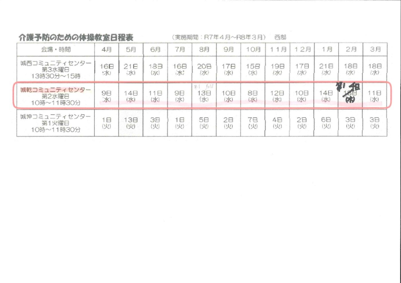 介護予防のための体操教室日程表